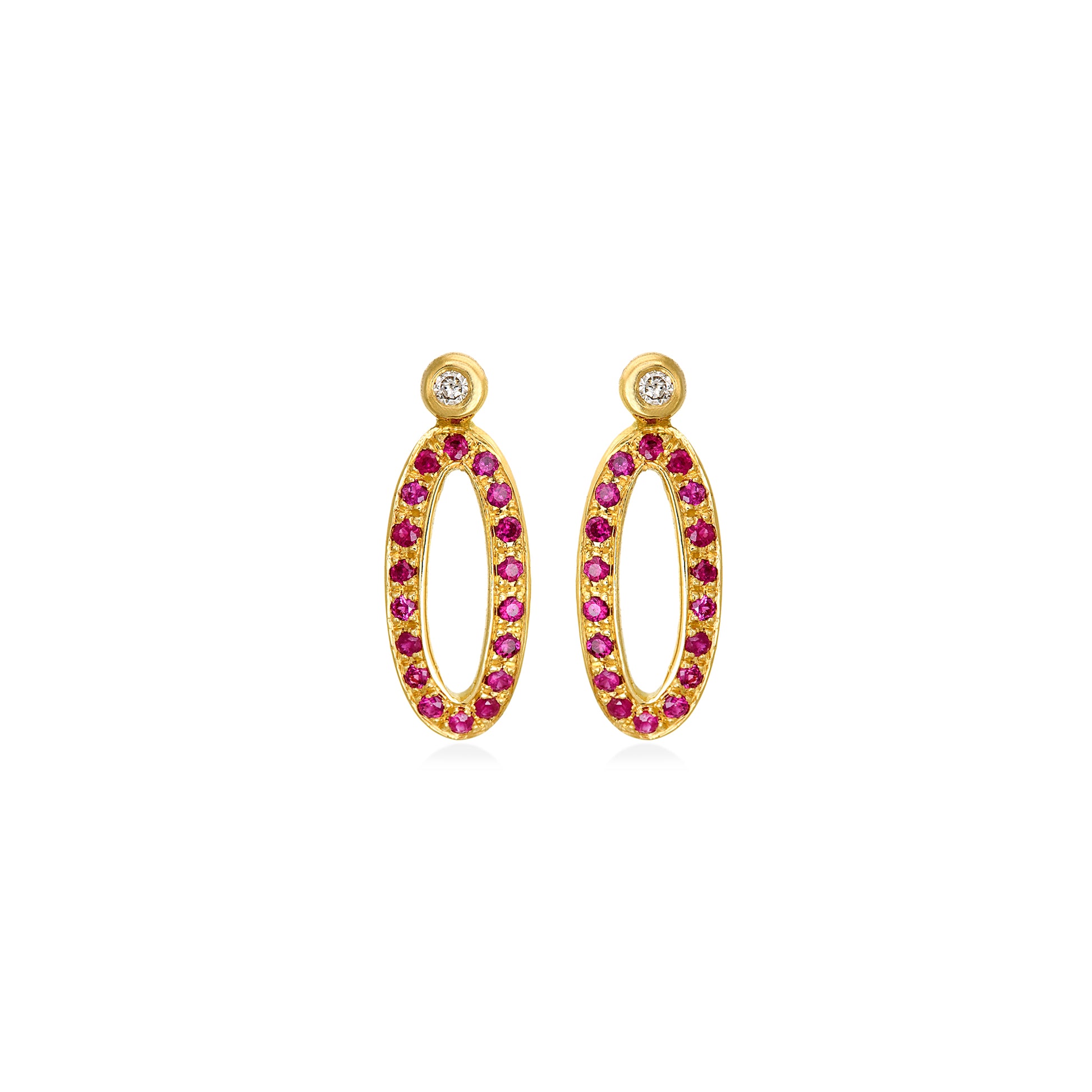These elegant earrings,oval silhouettes crafted in radiant 18k gold, adorned with 0.22 k Rubies trace the open oval frame, & 0.048 k brilliant-cut diamond sits at the top, adding a touch of refined sparkle and balance to the design. Perfect for both day and evening wear, these earrings blend classic form with bold, feminine color.