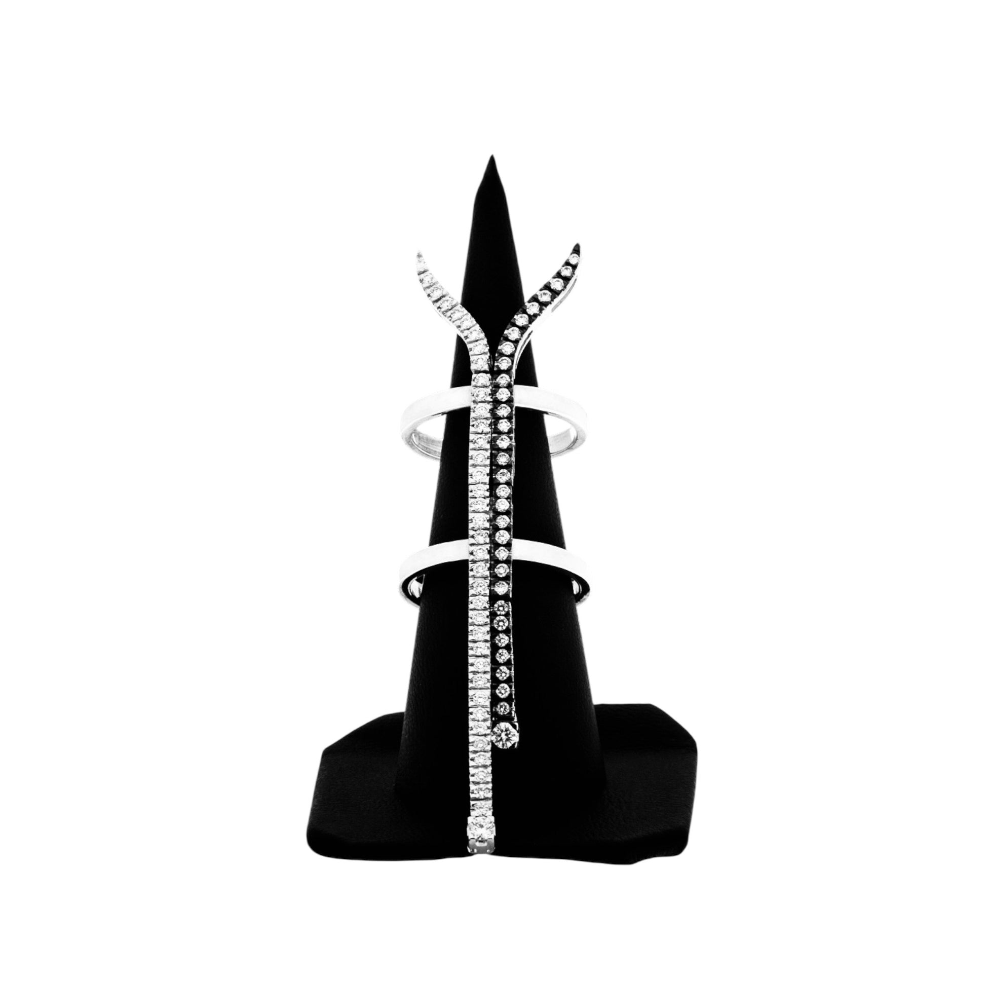 Ring in 18K white gold with white diamonds, designed in a continuous flowing line that merges dual tones. One side is finished with black platinoma, the other with white platinoma, creating a seamless dialogue between light and shadow. A refined balance of contrast and symmetry, embodying the essence of quiet sophistication & elegance