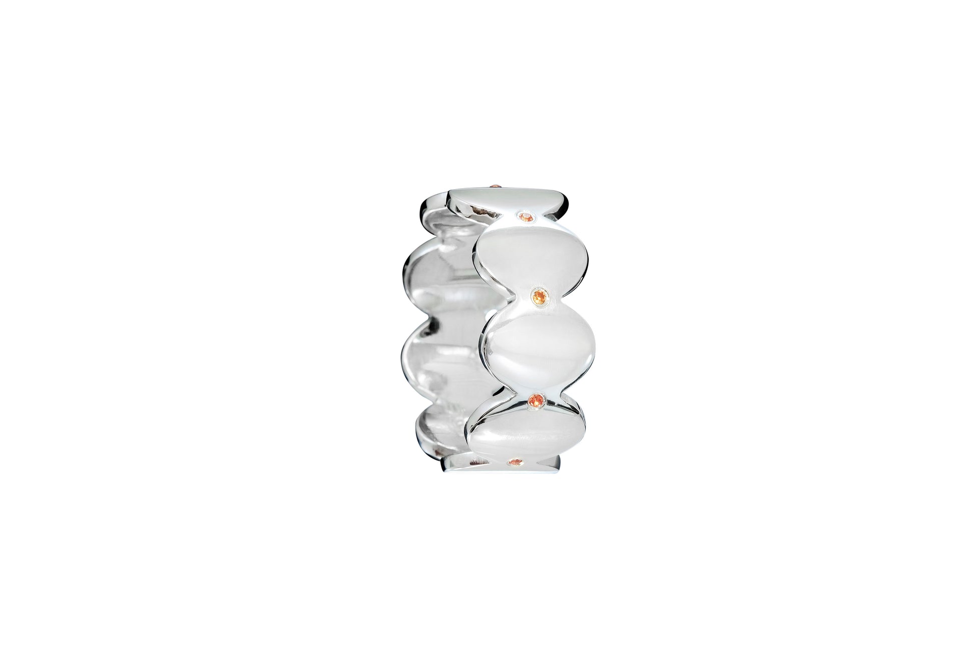 Crafted in polished 925 silver, this bold wave-shaped band is accented with radiant round orange sapphires. The sleek, reflective finish contrasts beautifully with the warm, vibrant stones, creating a modern design that brings a burst of color and energy to any look.