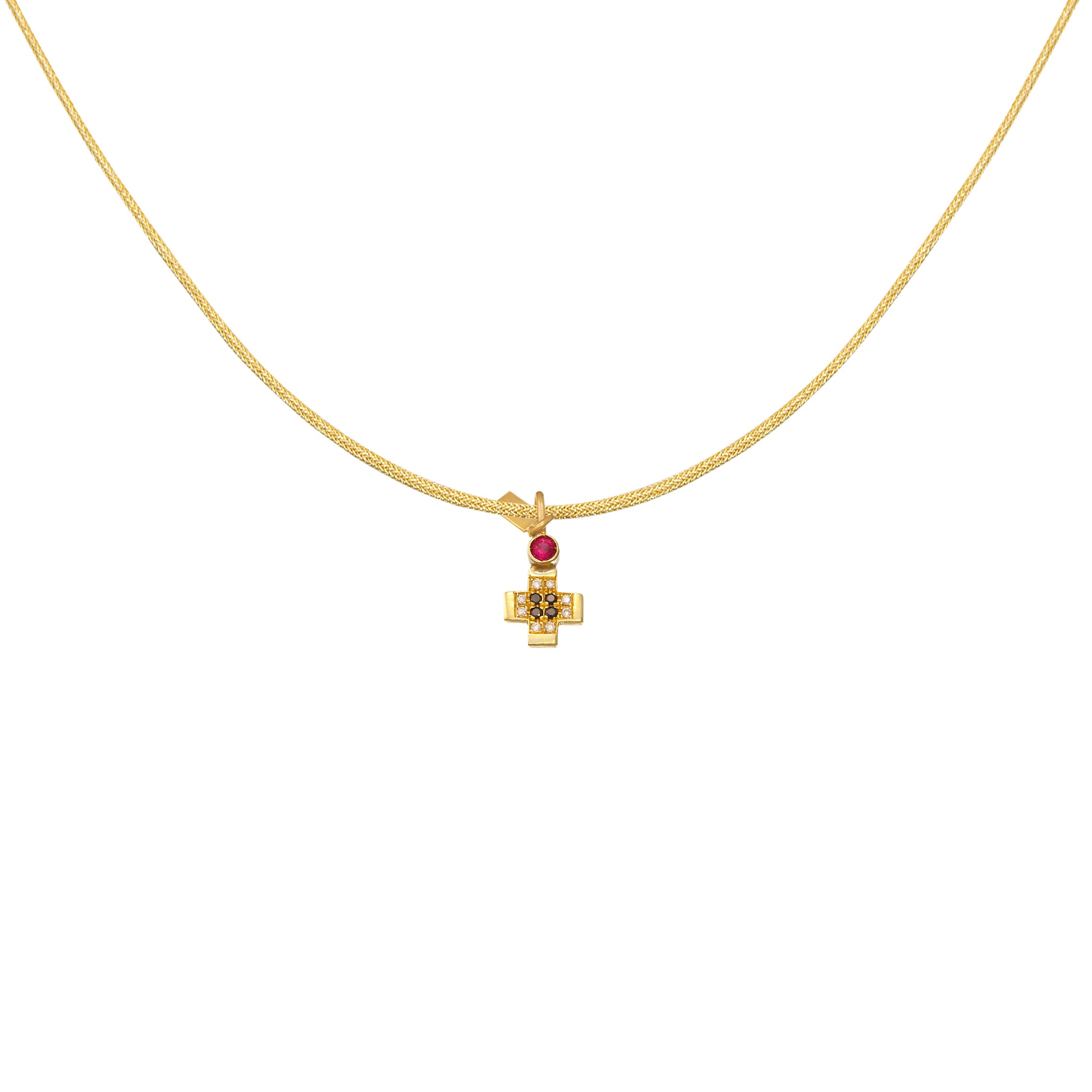 A refined gold cross pendant adorned with a vivid ruby and an intricate mosaic of White and black diamonds. A timeless piece blending sacred geometry with radiant elegance.