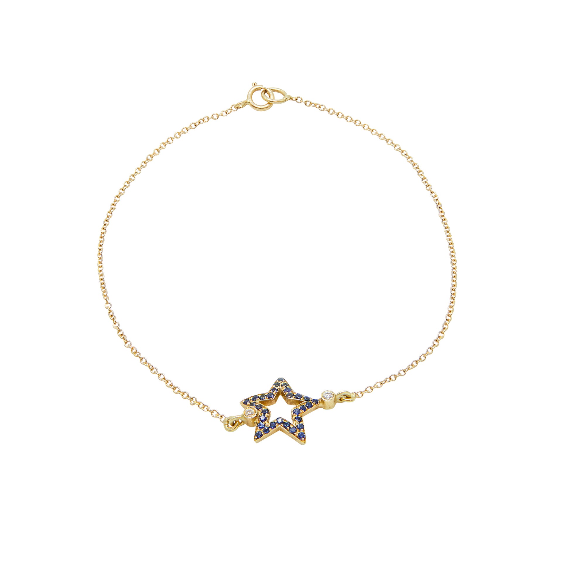 A delicate ode to the night sky, the Midnight Spark Bracelet features a gold chain adorned with a star-shaped charm encrusted with deep blue sapphires. A subtle diamond accent adds a glint of starlight, making this bracelet a refined yet playful piece ,perfect for adding celestial charm to any look. Wear it solo or layered for a cosmic touch of elegance.