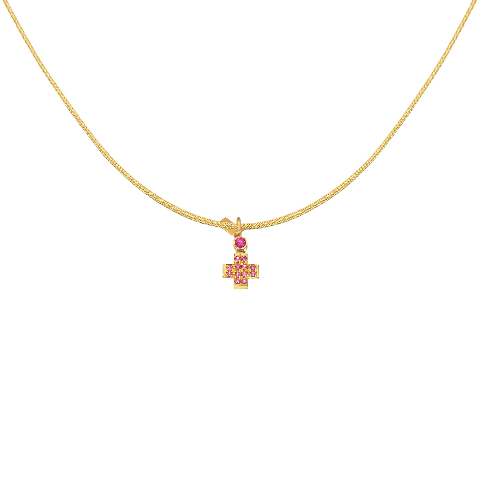 A luminous 18k gold cross pendant encrusted with pavé-set rubies, glowing with deep crimson intensitya bold and timeless expression of passion and power.