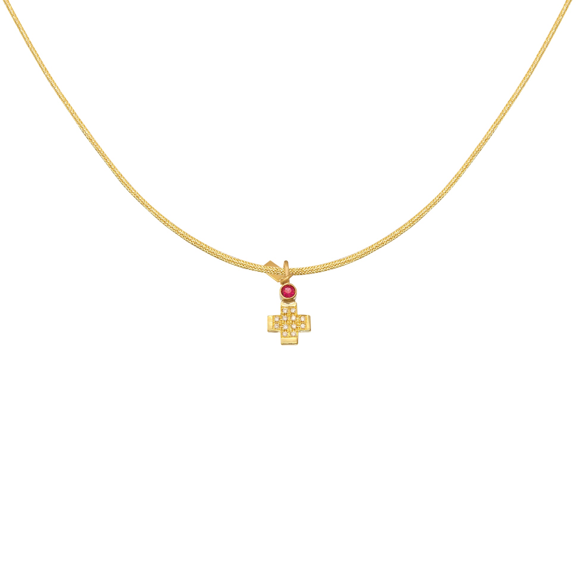 A radiant gold cross pendant encrusted with pavé-set white diamonds, crowned by a vivid ruby a striking fusion of fiery elegance and classic brilliance.
