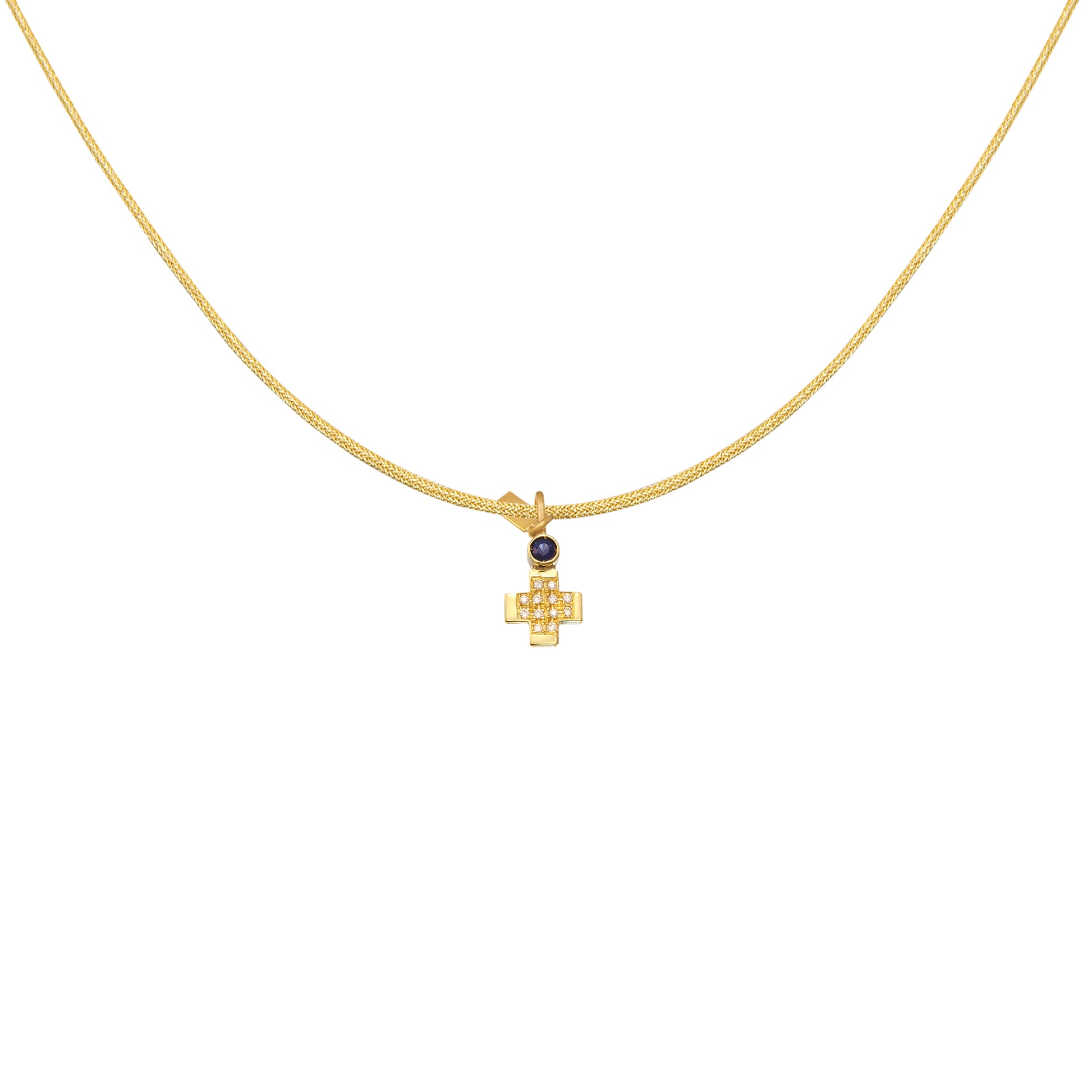 A refined 18 k gold cross pendant paved with sparkling white diamonds and crowned with a brilliant blue sapphire — a luminous blend of purity and depth in a timeless, elegant silhouette.