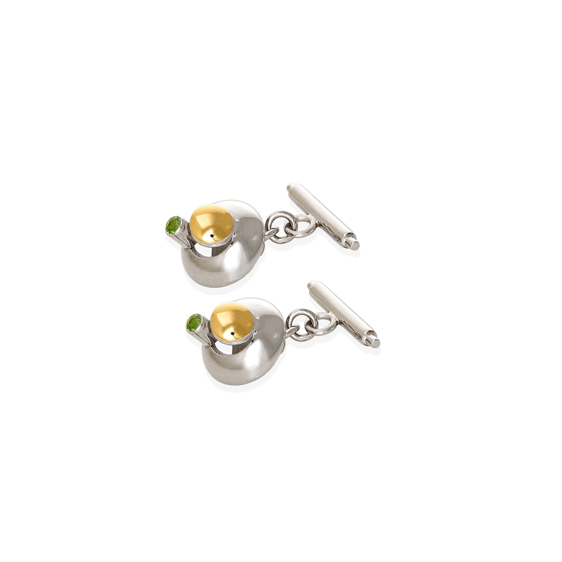 A bold interplay of precious metals and vibrant gemstone, these cufflinks combine polished 925 silver and 18 k gold accents with a striking green peridot . Sculptural and contemporary, they offer a refined touch of color and character to any formal ensemble.