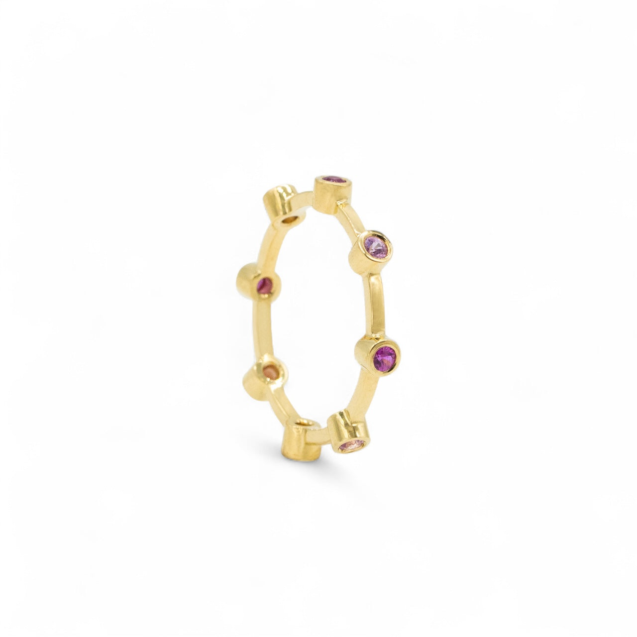 A golden band comes alive with the sparkle of light and dark pink sapphires, delicately scattered along its organic form. Rosé Glint captures the essence of blooming petals kissed by sunlight, offering a romantic and vibrant touch. Perfect for stacking or wearing solo with effortless elegance.