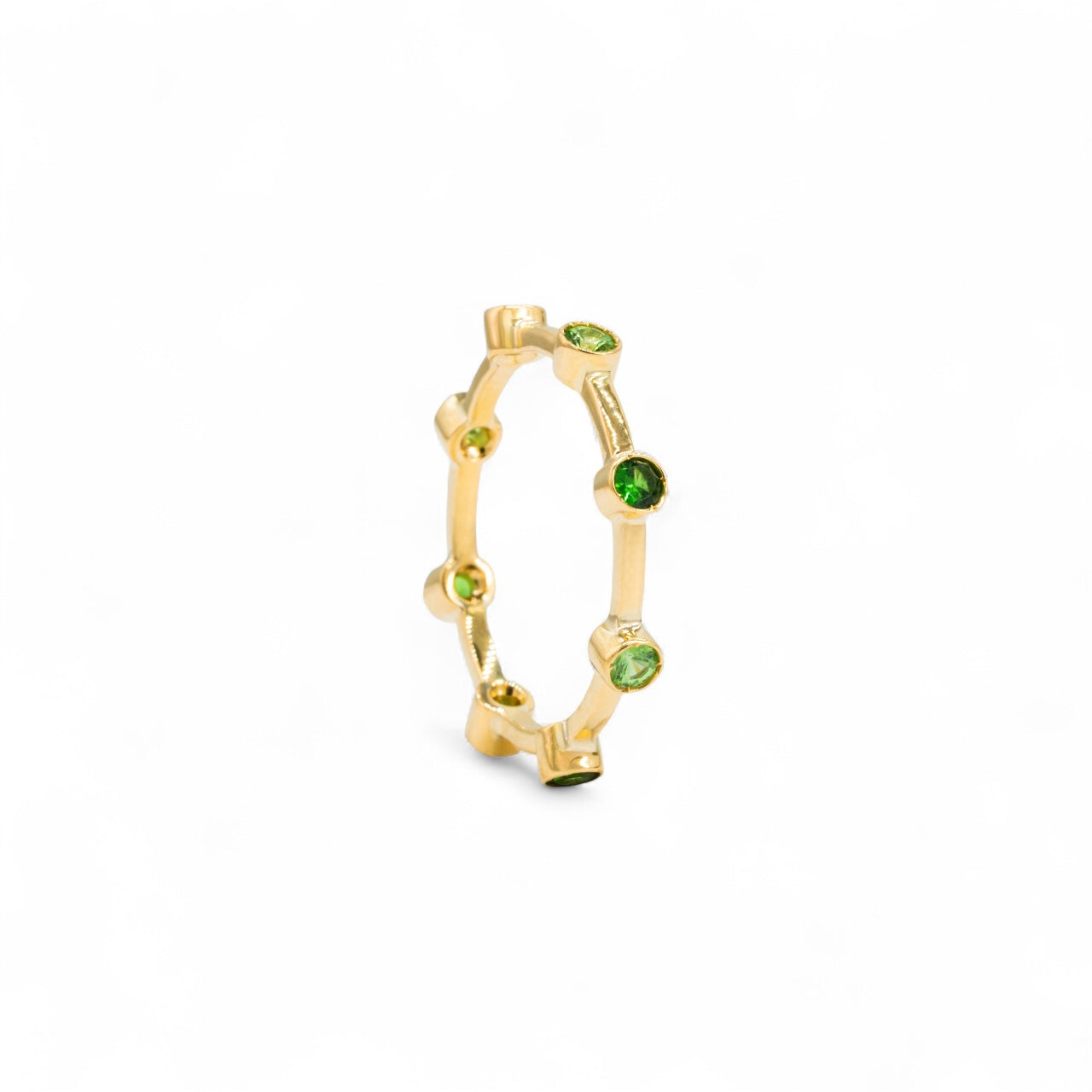 Crafted in 18 k gold, Verdant Glint features a flowing band adorned with tsavorites in two captivating shades light and dark green. The alternating tones create a lively play of color, echoing sunlight through layered foliage. Elegant yet playful, it’s a stackable ring that brings natural vibrance to any look.